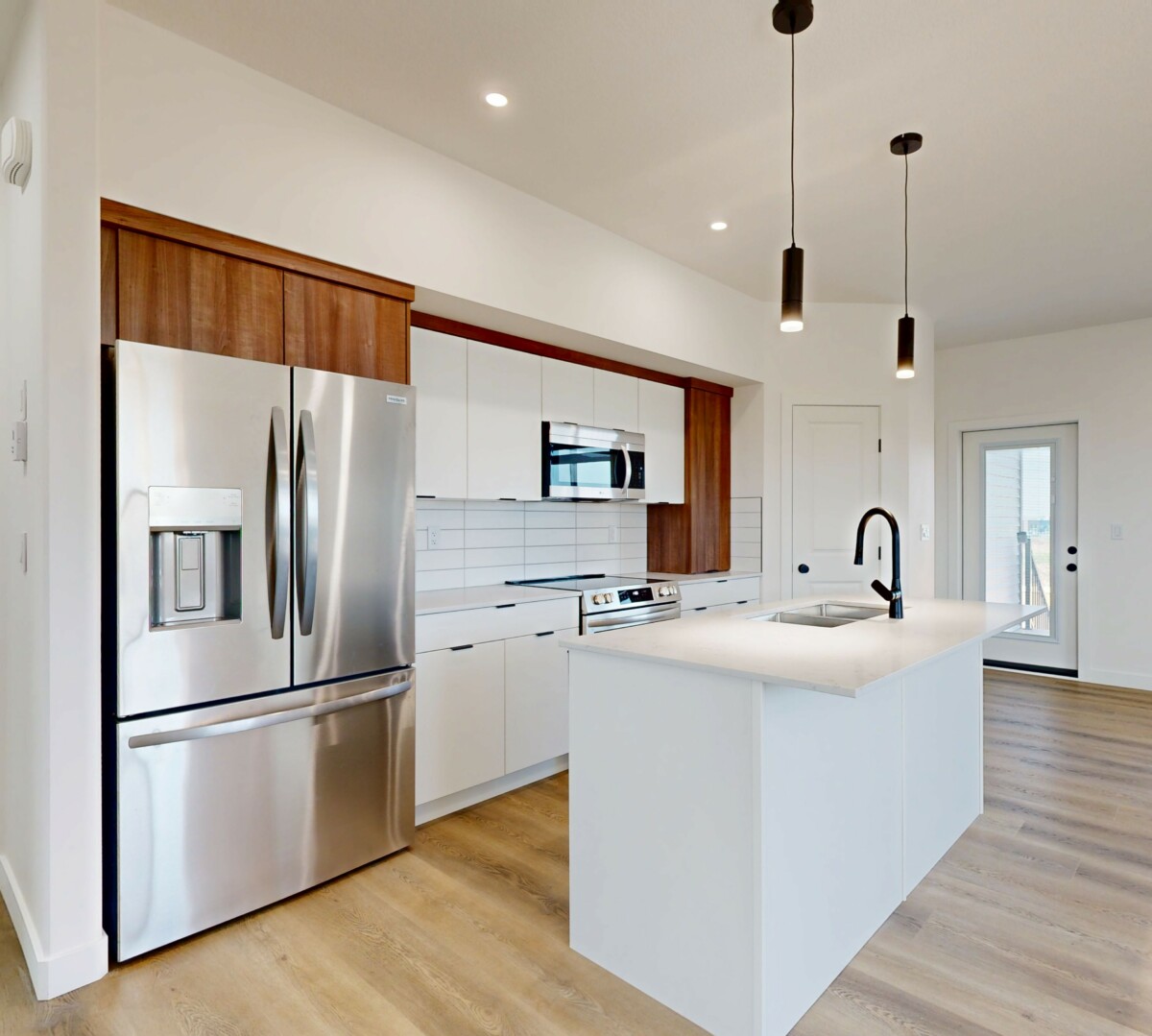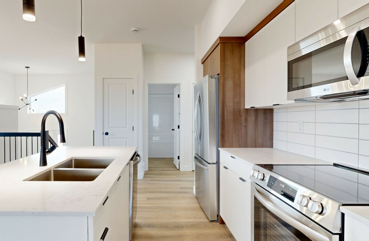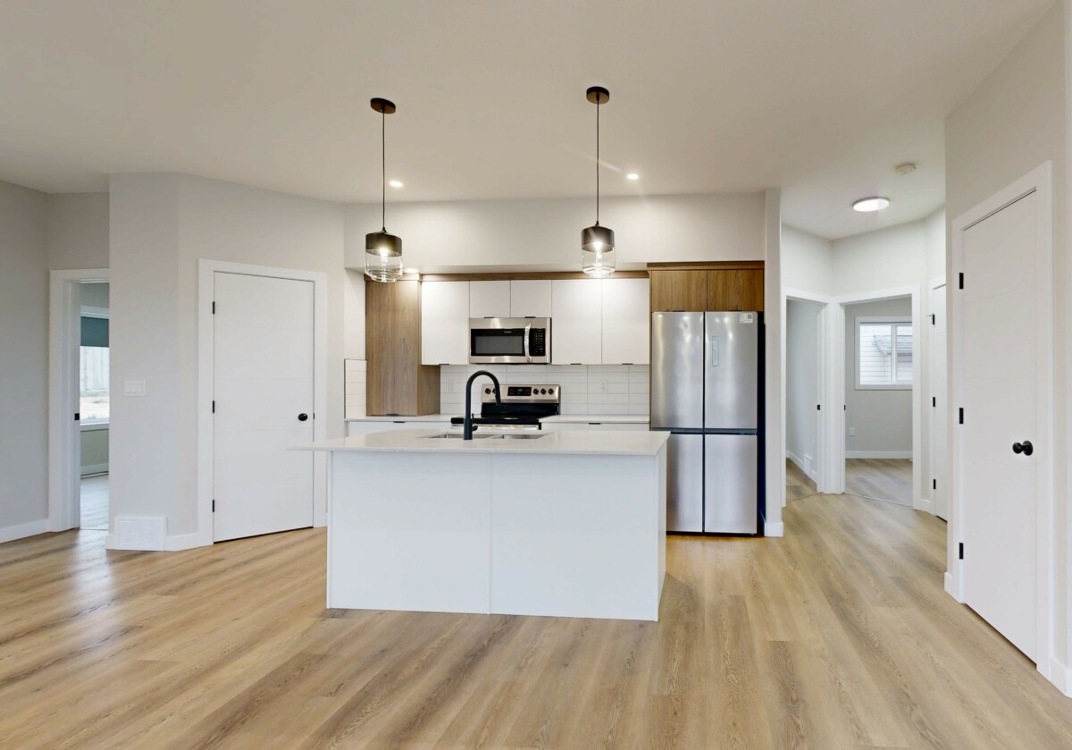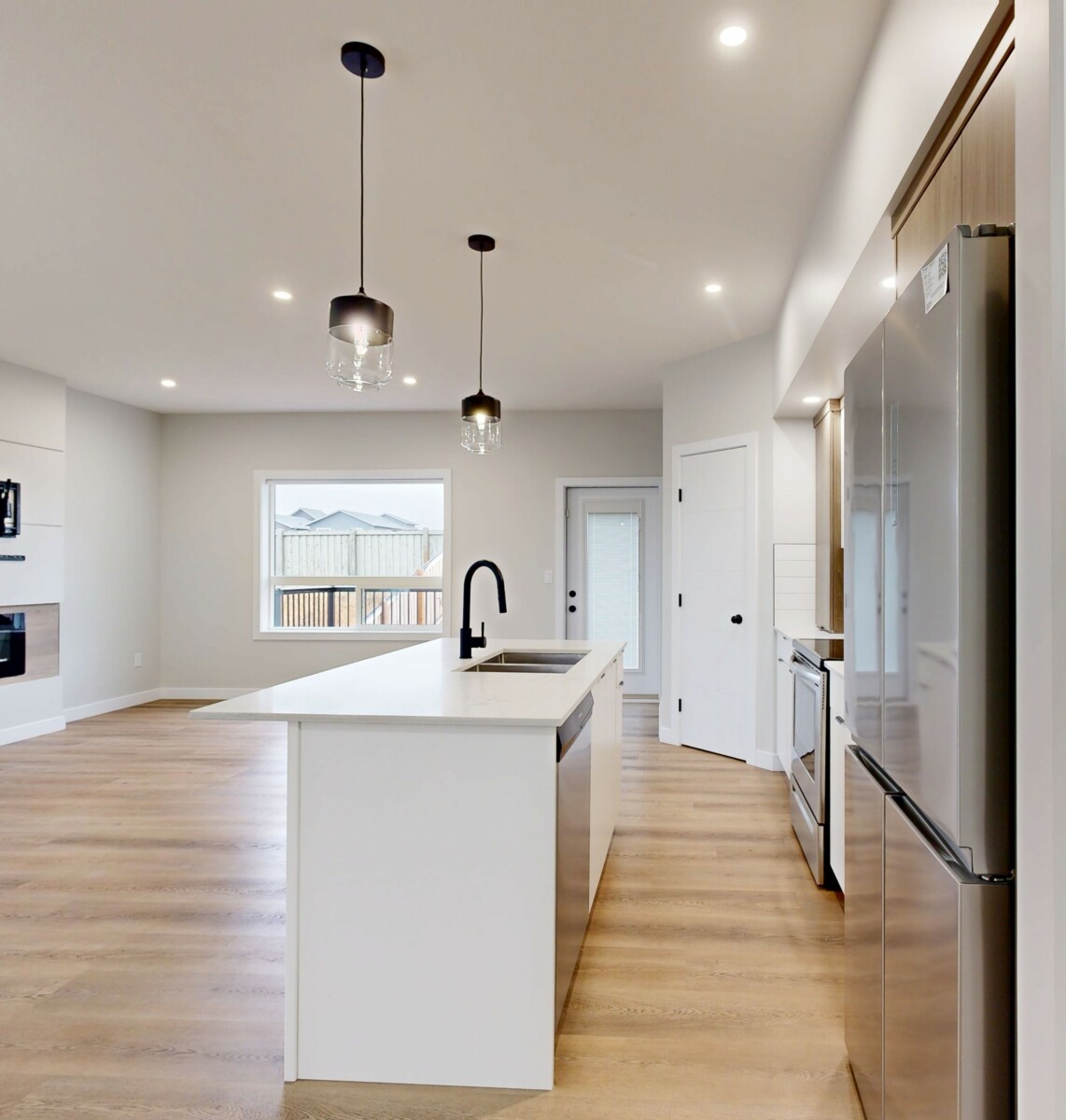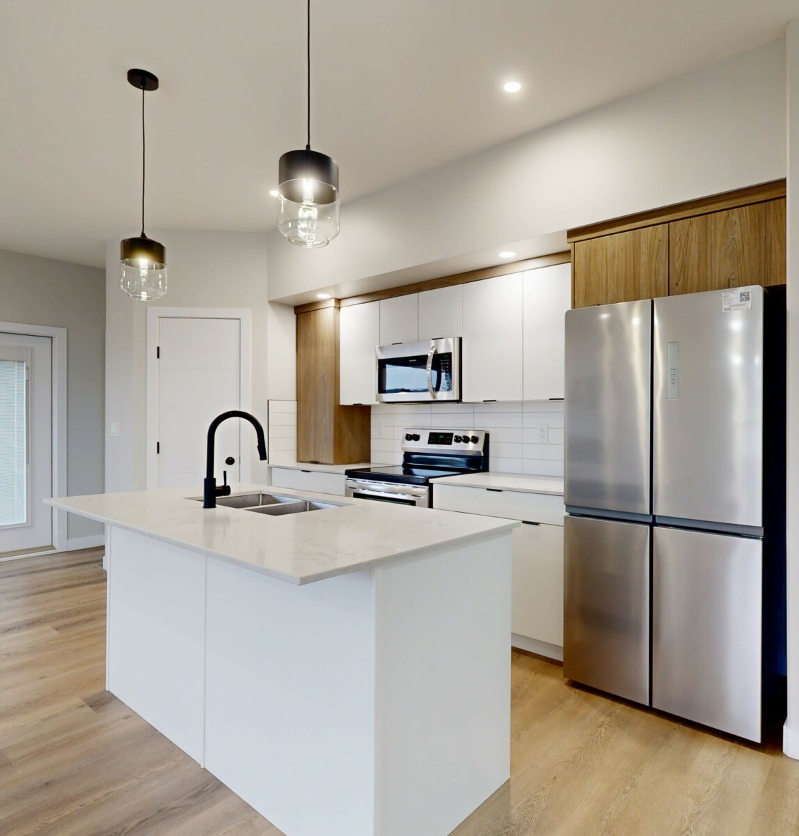 This beautifully designed home offers a warm, welcoming atmosphere with a modern flair. Step inside to a spacious entryway featuring contemporary black metal stair railings and clean lines. The luxury vinyl plank flooring flows seamlessly throughout the main living area, which is flooded with natural light. A built-in electric fireplace adds a cozy, functional focal point to the living room. The stunning kitchen is a blend of style and practicality, showcasing crisp white cabinetry, warm wood-tone accents, stainless steel appliances, and a spacious island with a built-in sink, perfect for entertaining or everyday use. The induction stove offers fast, energy-efficient cooking with a sleek, modern look. The primary bedroom features a walk-in closet and a full en-suite bathroom. Two additional well-sized bedrooms are located nearby, along with a second full bathroom for added convenience. Enjoy the privacy of your own in-suite laundry.