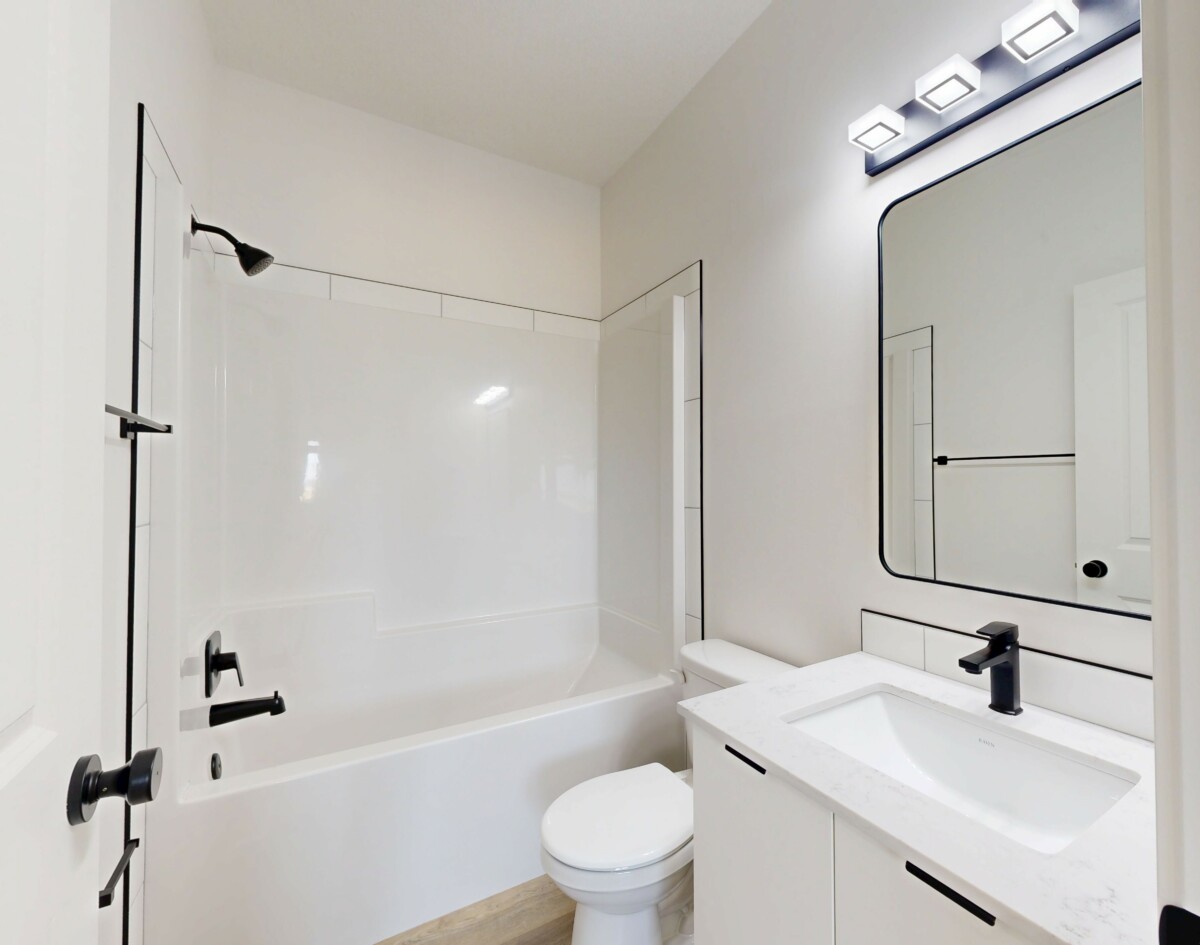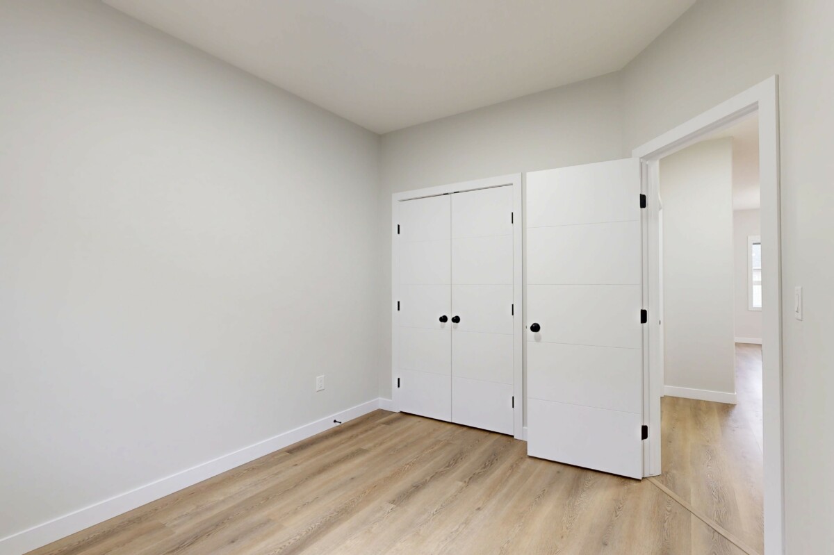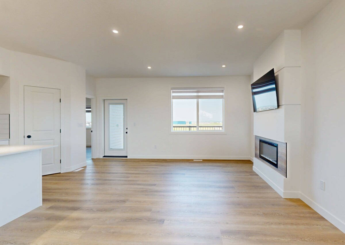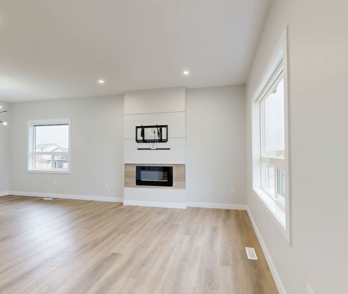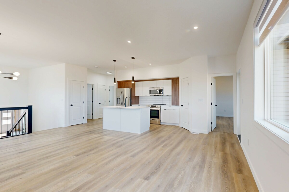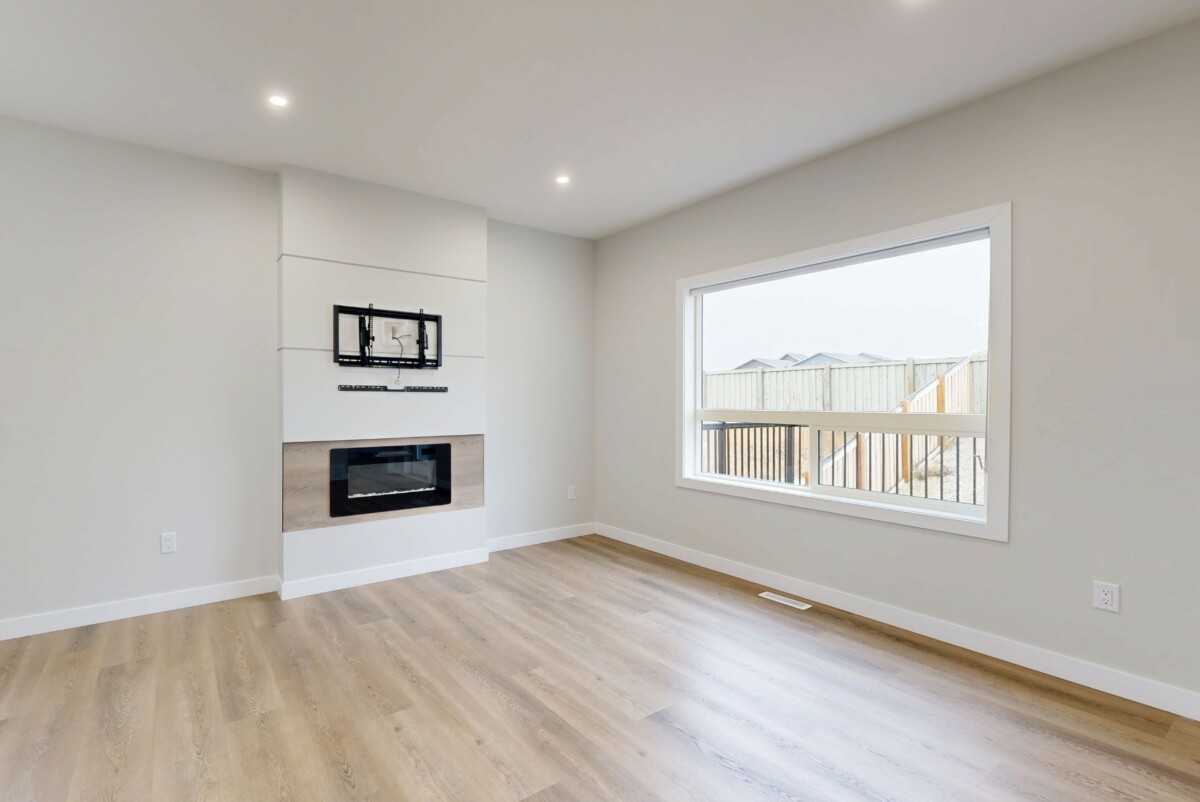 This beautifully designed home offers a warm, welcoming atmosphere with a modern flair. Step inside to a spacious entryway featuring contemporary black metal stair railings and clean lines. The luxury vinyl plank flooring flows seamlessly throughout the main living area, which is flooded with natural light. A built-in electric fireplace adds a cozy, functional focal point to the living room. The stunning kitchen is a blend of style and practicality, showcasing crisp white cabinetry, warm wood-tone accents, stainless steel appliances, and a spacious island with a built-in sink, perfect for entertaining or everyday use. The induction stove offers fast, energy-efficient cooking with a sleek, modern look. The primary bedroom features a walk-in closet and a full en-suite bathroom. Two additional well-sized bedrooms are located nearby, along with a second full bathroom for added convenience. Enjoy the privacy of your own in-suite laundry.