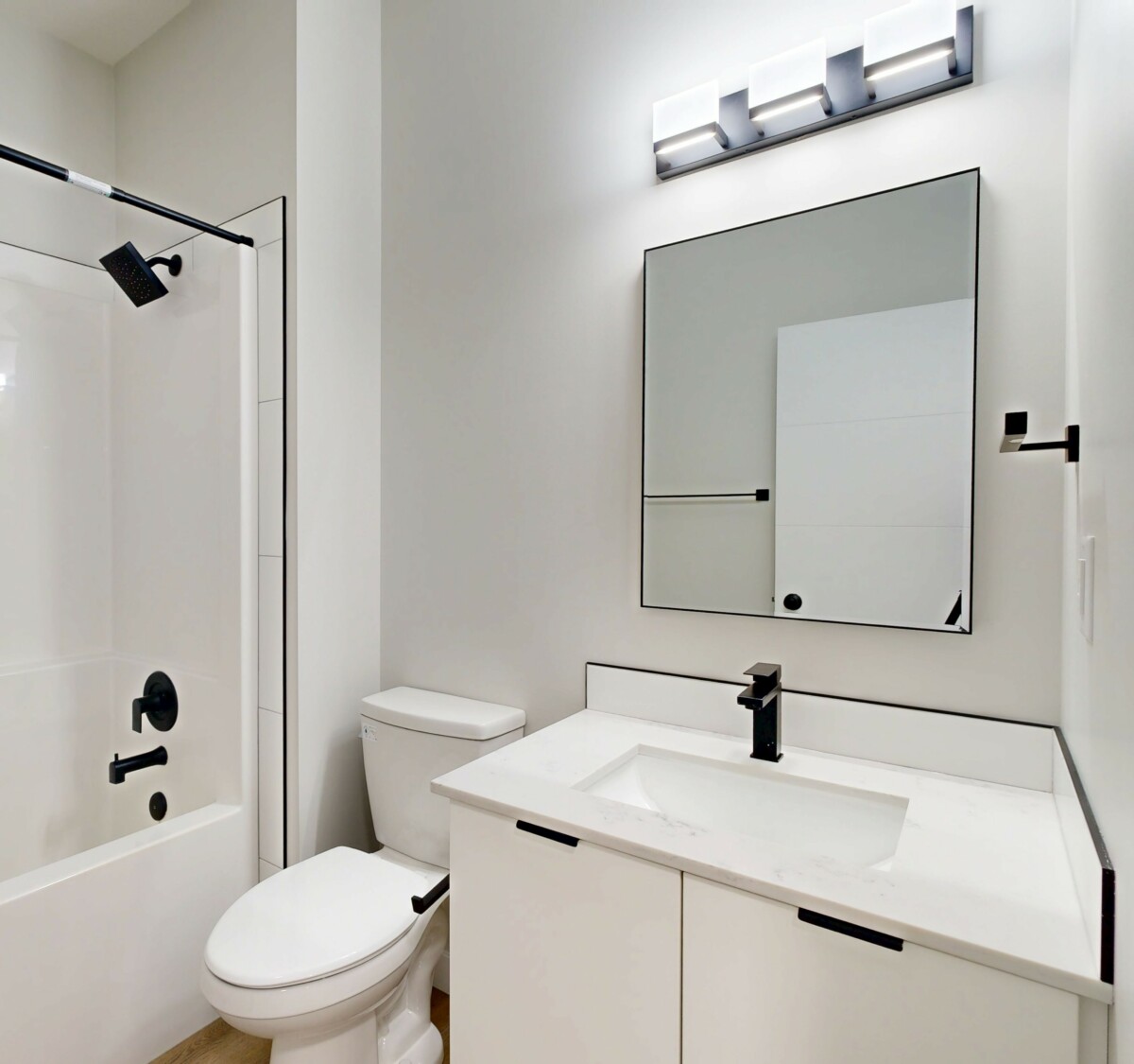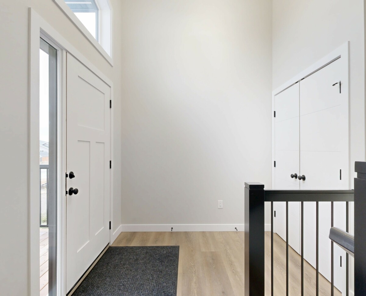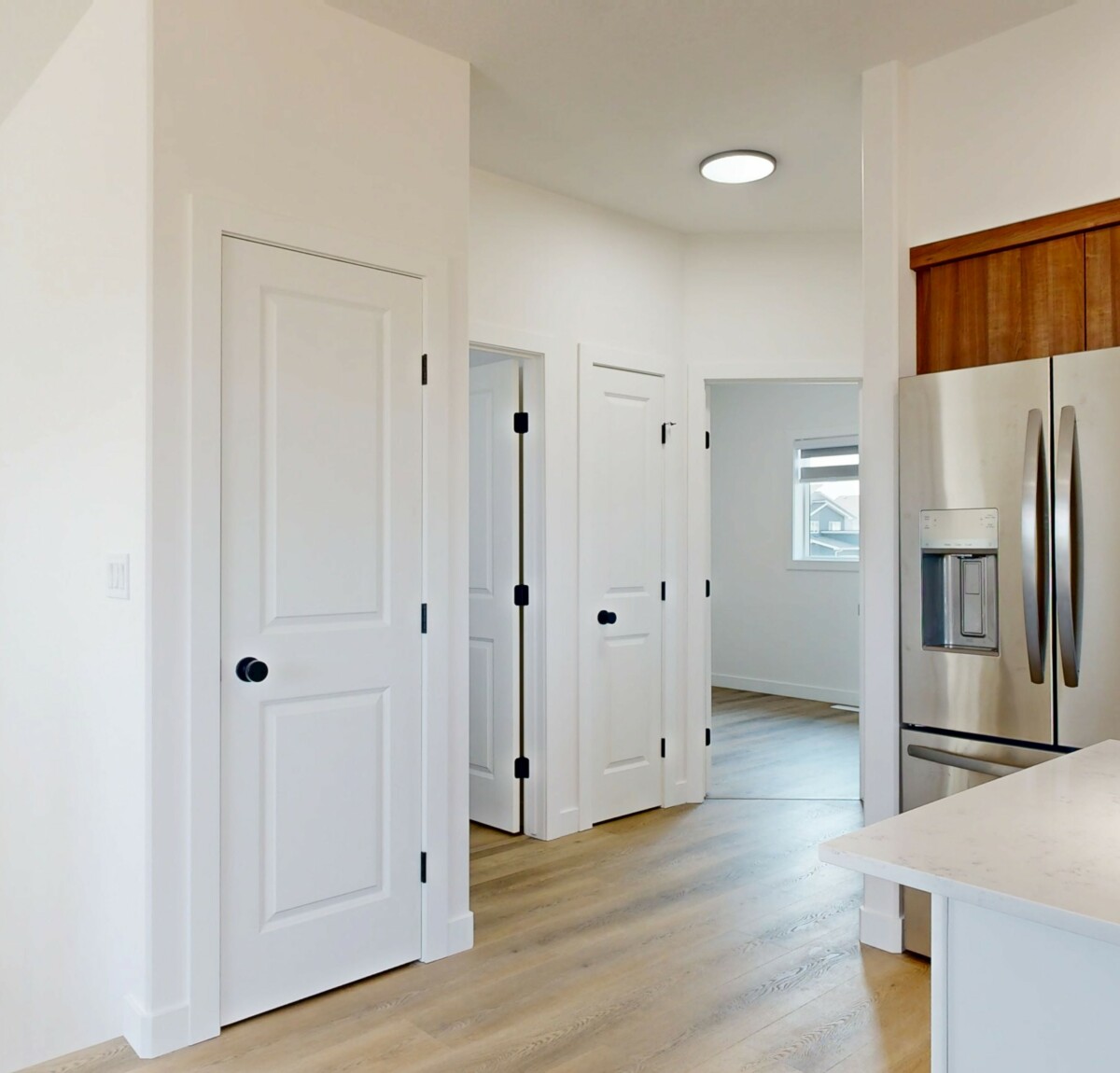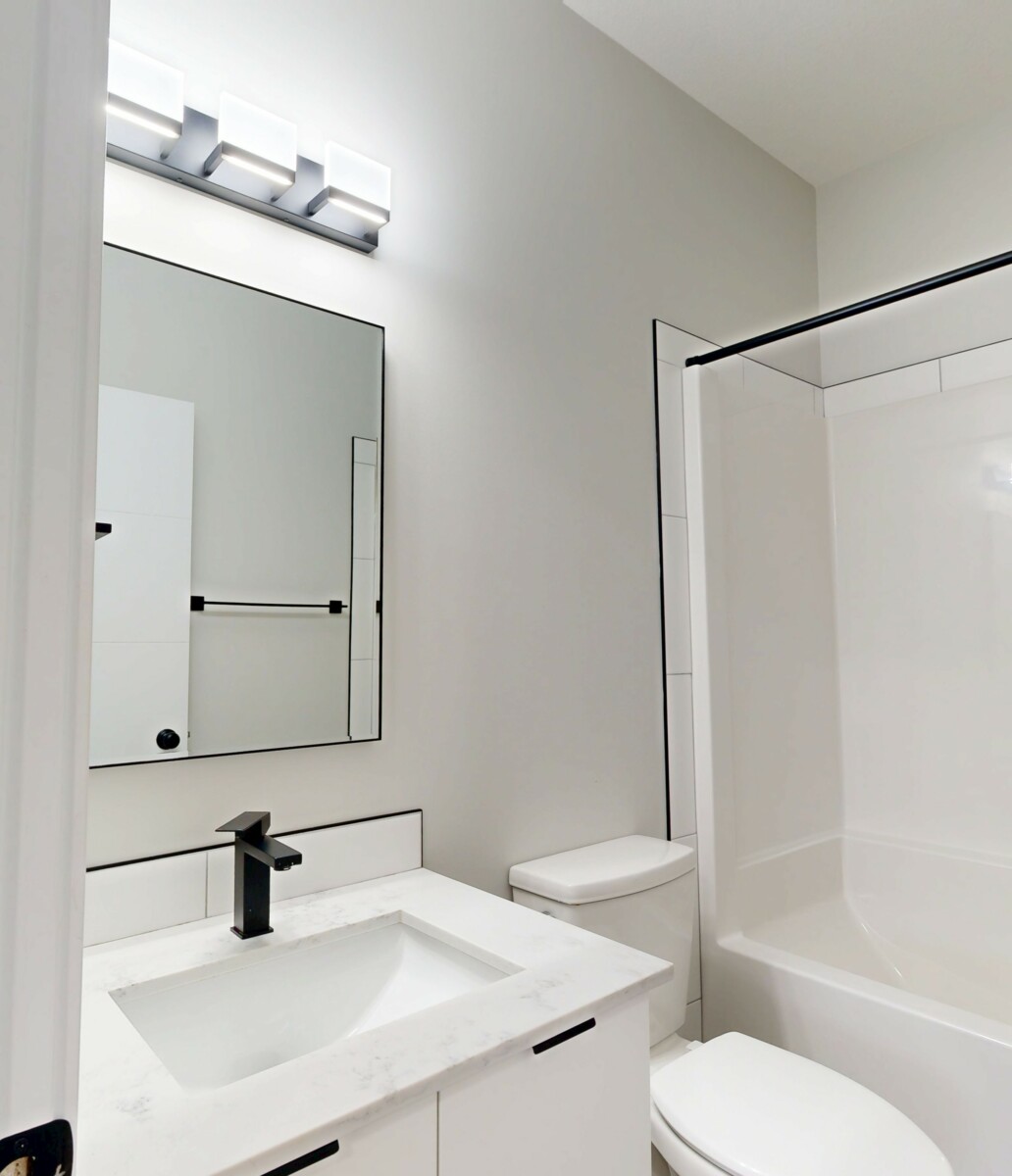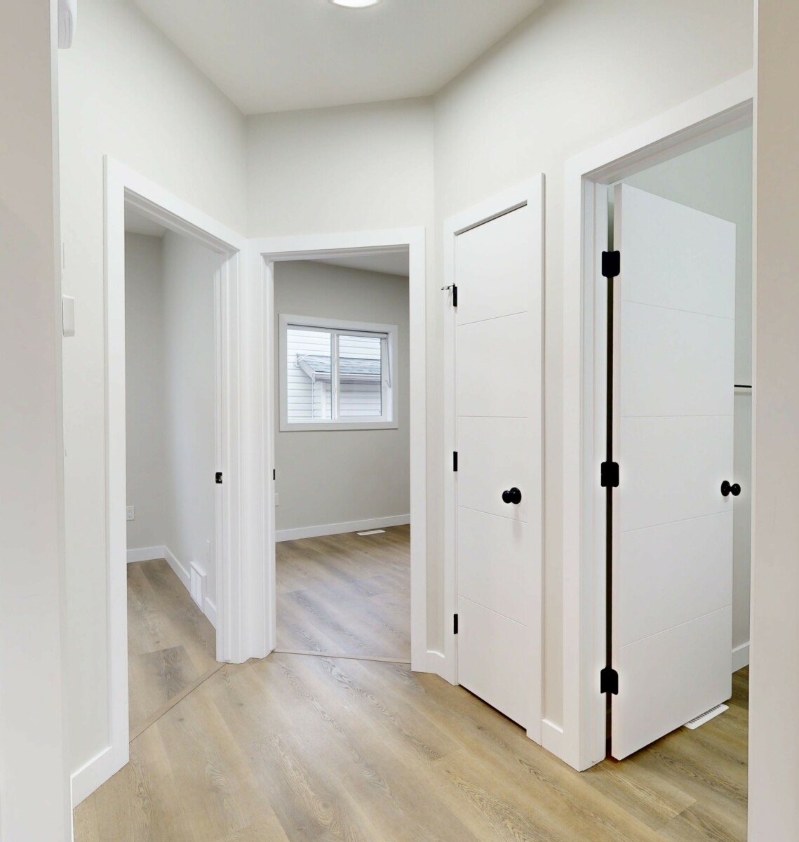 This beautifully designed home offers a warm, welcoming atmosphere with a modern flair. Step inside to a spacious entryway featuring contemporary black metal stair railings and clean lines. The luxury vinyl plank flooring flows seamlessly throughout the main living area, which is flooded with natural light. A built-in electric fireplace adds a cozy, functional focal point to the living room. The stunning kitchen is a blend of style and practicality, showcasing crisp white cabinetry, warm wood-tone accents, stainless steel appliances, and a spacious island with a built-in sink, perfect for entertaining or everyday use. The induction stove offers fast, energy-efficient cooking with a sleek, modern look. The primary bedroom features a walk-in closet and a full en-suite bathroom. Two additional well-sized bedrooms are located nearby, along with a second full bathroom for added convenience. Enjoy the privacy of your own in-suite laundry.