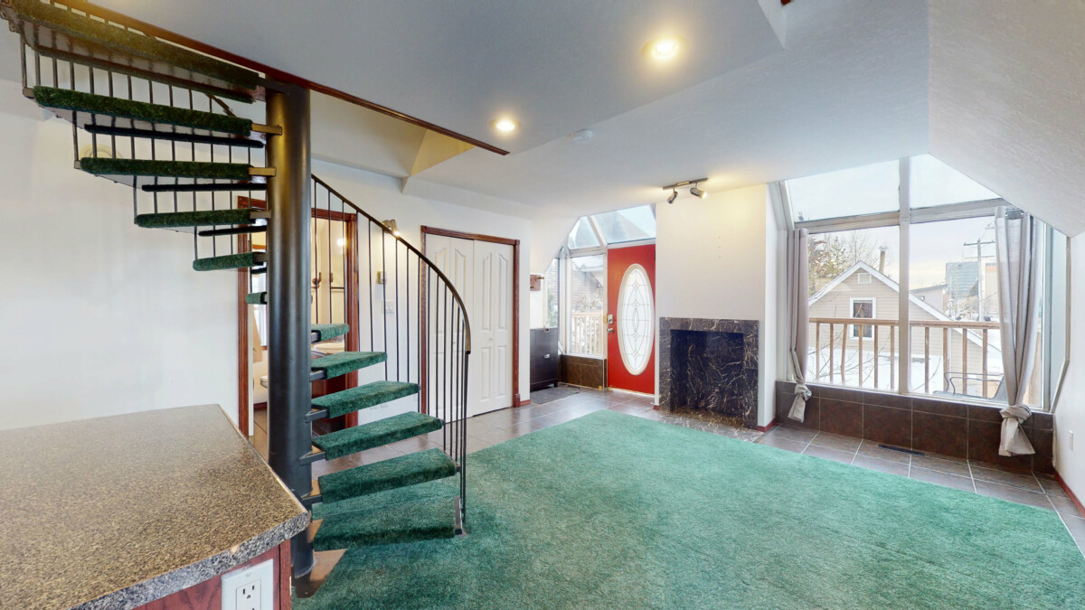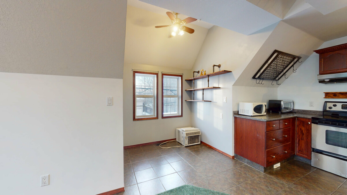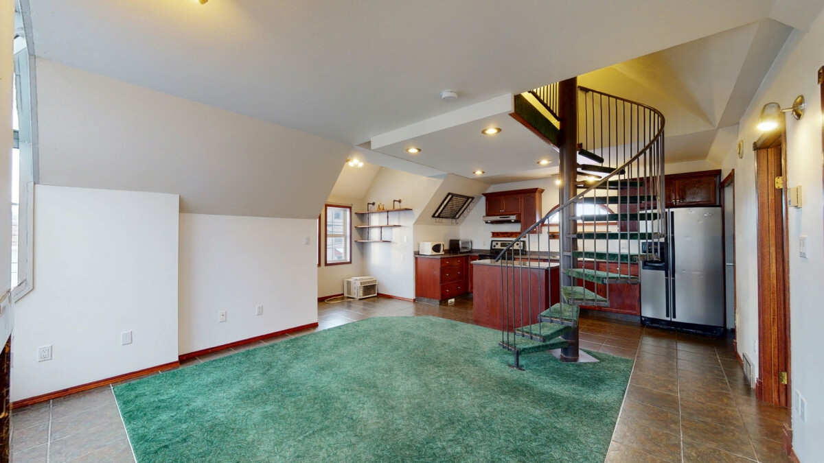 The perfect suite for the single individual! Enjoy a minimalistic lifestyle with this cozy suite. In through the entry into the open concept space with natural light throughout. Bifold closet at the entry with an organizer so you can store your daily attire and outdoor wear. Authentic green carpet and the swirly staircase keep this character home unique. An L-shaped kitchen with an island to give you that extra storage and meal prep space. Small dining nook tucked to the left of the kitchen for you to enjoy your morning breakfast. To complete the Carriage suite is a small loft area where you could put your bed and a full bathroom with a long vanity. Bellow your suite you can find the double car garage with one bay door on the alley side and on the main entrance side. This is the perfect spot to store your vehicle in the winter months and there is lots of room for the working guy to enjoy fixing up their side project car. In the garage you can also find a second full bathroom and your private laundry machines.